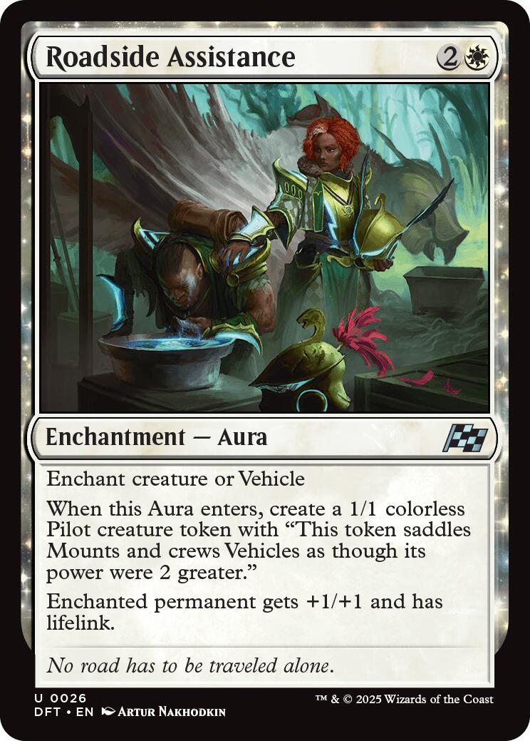 Enchanted permanent gets +1/+1 and has lifelink. - Flavor: No road has to be traveled alone.