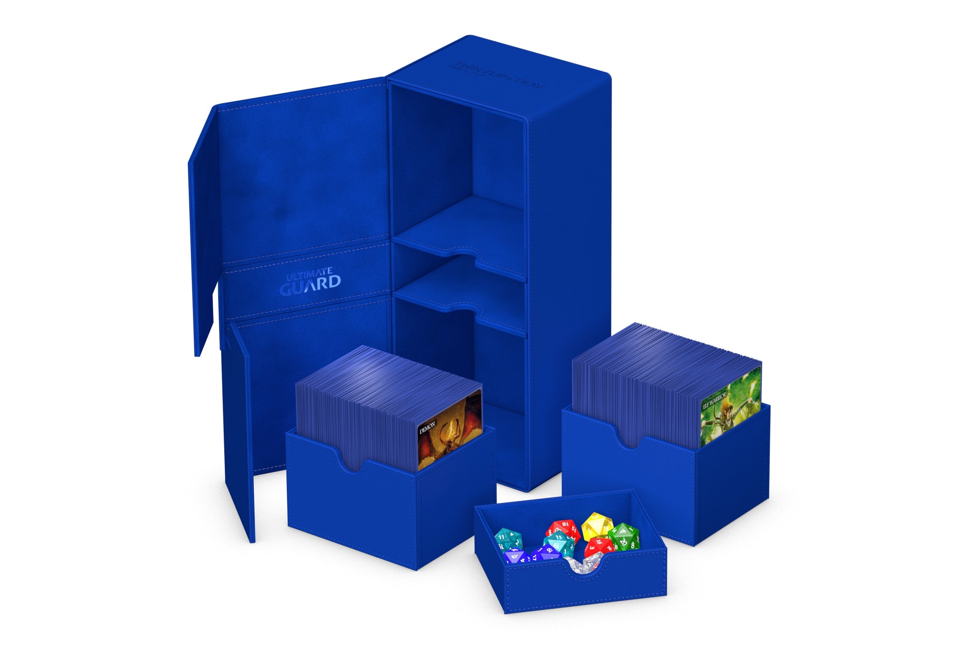 Your two best Commander decks, an extra compartment for accessories and additional space for as many Elf tokens as you can generate: With our Twin FlipnTray 266+ you have everything you need for a successful game night in one deck box. Designed specifically for Commander/EDH decks, the Twin FlipnTray 266+ features two card trays that hold up to a total of 266 (double sleeved) or 315 (single sleeved) standard size cards in Ultimate Guard sleeves. Both card compartments as well as the accessory compartment can be opened independently of each other.